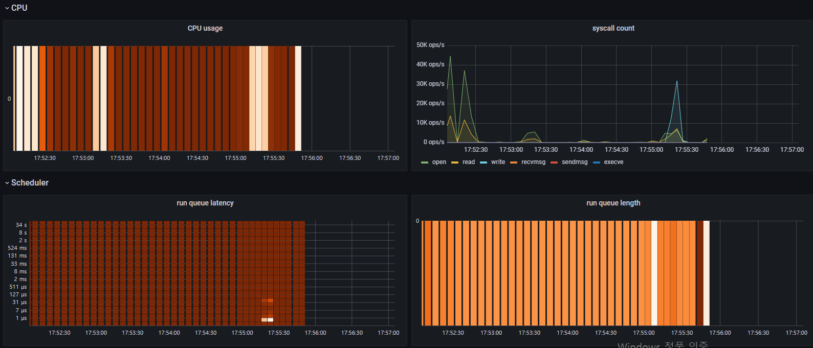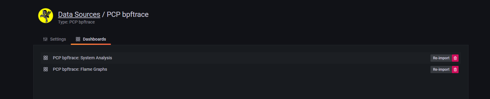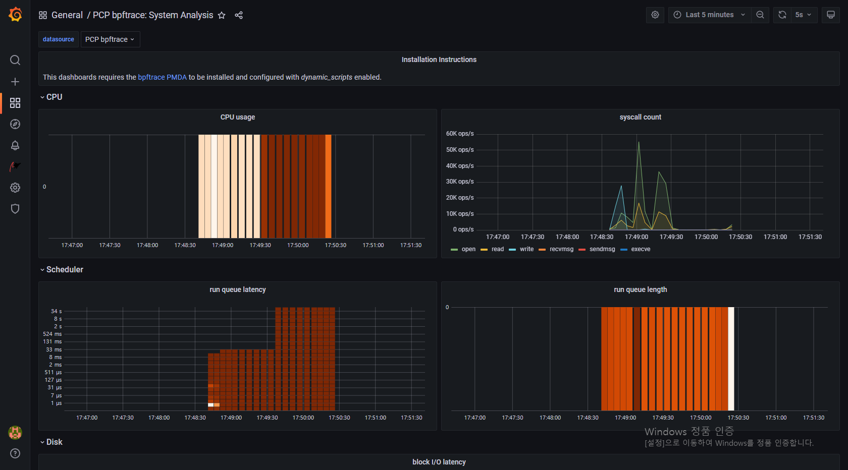 데이터 소스에서 PCP bpftrace로 들어가면 미리 만들어진 대시보드를 사용할 수 있다. 잘 작동하는지 확인해보자.