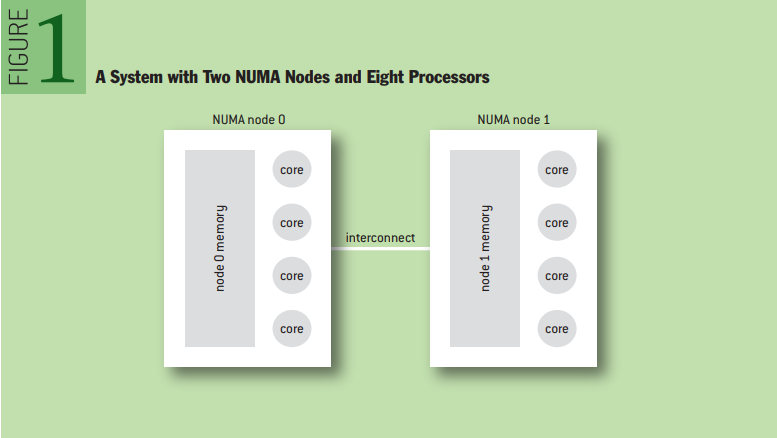 NUMA에서는 메모리를 노드라는 단위로 나누어지게 되는데, 프로세서마다 노드에 대한 접근 속도가 다르다. 아래 사진은 8개의 프로세서와 2개의 NUMA 노드로 이루어진 시스템을 그림으로 표현한 것이다. 아래의 예시에서는 왼쪽의 네 개의 프로세서는 node0에 대한 접근 속도가 node1에 대한 접근 속도보다 빠르며, node1에 접근하려면 interconnect를 통해 접근해야 하므로 node0보다 시간이 많이 소요된다.