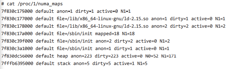 리눅스에서 프로세스가 어느 메모리가 어느 노드에 할당되었는지 보려면 proc filesystem으로 확인할 수 있다. /proc/<pid>/numa_maps를 확인하면 된다.