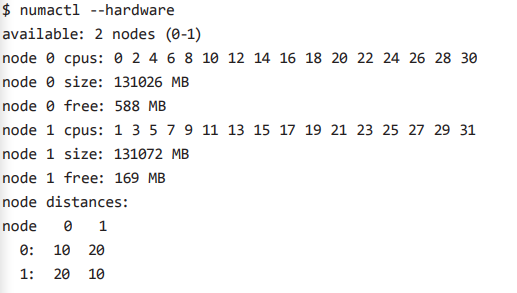 시스템의 NUMA 특성을 확인하는 방법은 많다. 하드웨어의 특성을 확인하려면 numactl -hardware를 입력하면 된다. numactl -hardware는 SLIT (System Locality Information Table)의 덤프를 떠서 보여준다. 아래의 예시는 두 개의 NUMA 노드로 구성된 시스템을 보여준다. 로컬 노드에 대한 distance는 10이고, 리모트 노드에 대한 distance는 20으로 두배이다. 다만 실제로 정확히 distance가 10과 20이 아님에도 그냥 10과 20으로 보여주는 벤더도 있다는걸 주의하자. 그냥 차이가 어느 정도 나는지 가늠하는 데 사용하면 될듯 하다.